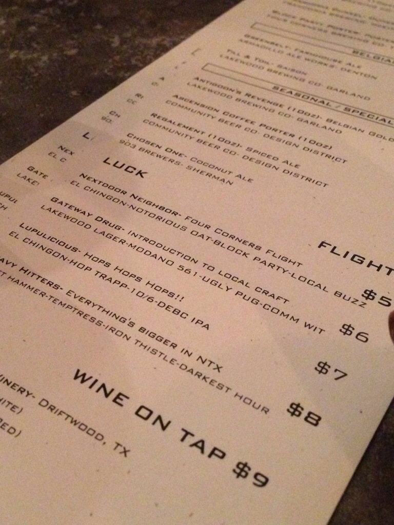 Next, we headed to Luck in Trinity Groves for some flights. If you haven’t made a trip over on a Friday night, you should. The vibe is just so cool. The large outdoor seating is awesome. It’s relaxed and it’s fun and you are just surrounded by how beautiful the area has transformed and all the different people that make their way there. If you ever need a break from Uptown, head this way. I can’t say the level of pretentiousness goes down, but with downtown Dallas as a backdrop who cares. All our beers at Luck come only from local breweries in Dallas. I’m glad I got to check off a few more places off my list.