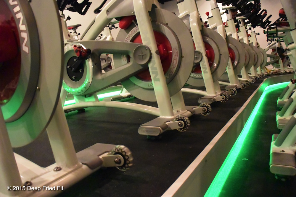 The Studio: The studio is beautiful with a tasteful black and green theme. Definitely has a feminine feel to it. The studio is immaculate and there’s a friggin chandelier!! When you enter, the front desk is immediately to your right. As you walk into the studio, you’ll see a large open space aka Studio B, where members can stretch pre- and post class. Non-spin classes such as core workouts, deep stretch and TRCX classes will also be offered in the space too. As you continue through the studio, the space opens up toward the back. You’ll see plenty of lockers, changing rooms, bathrooms and Studio A where you’ll take your ride.