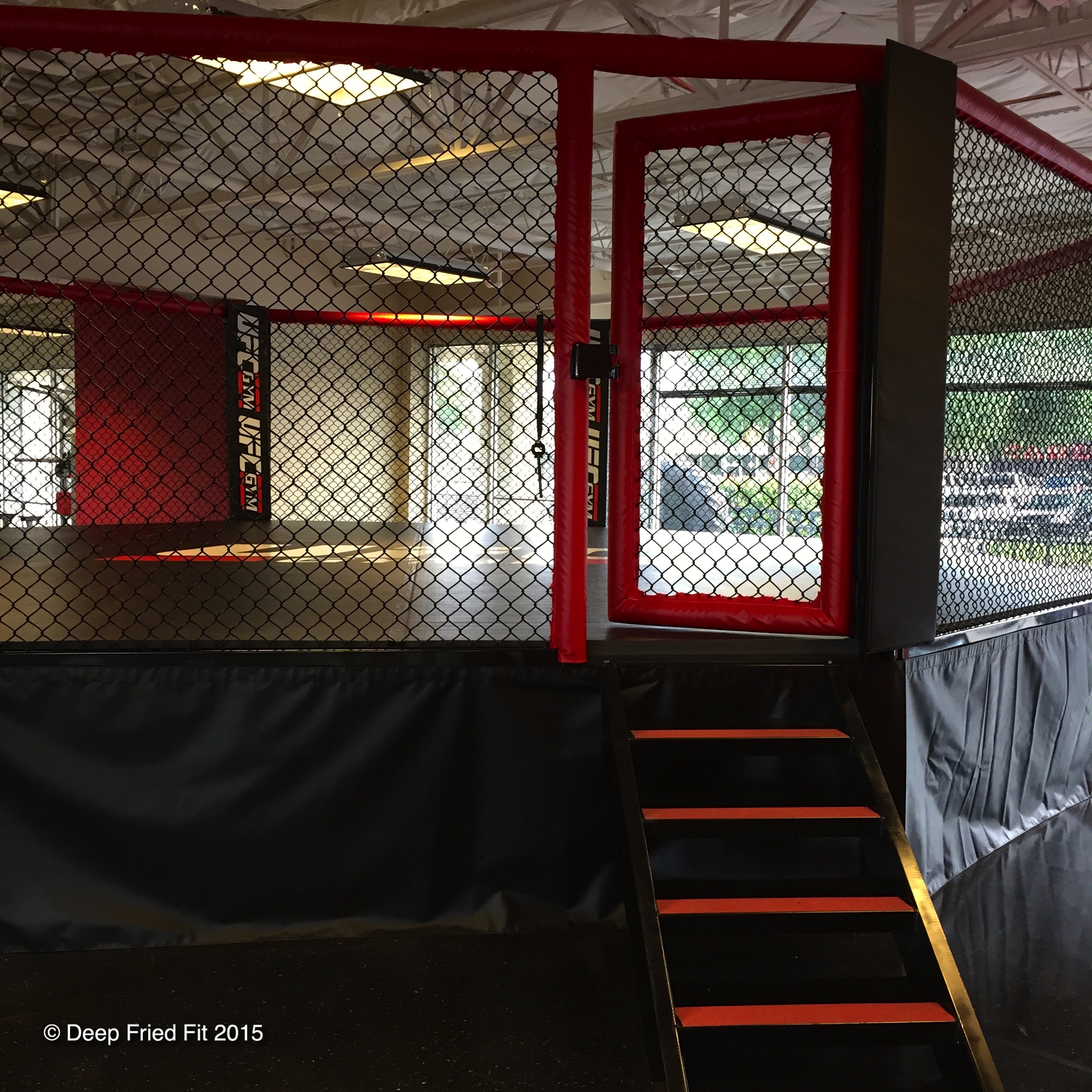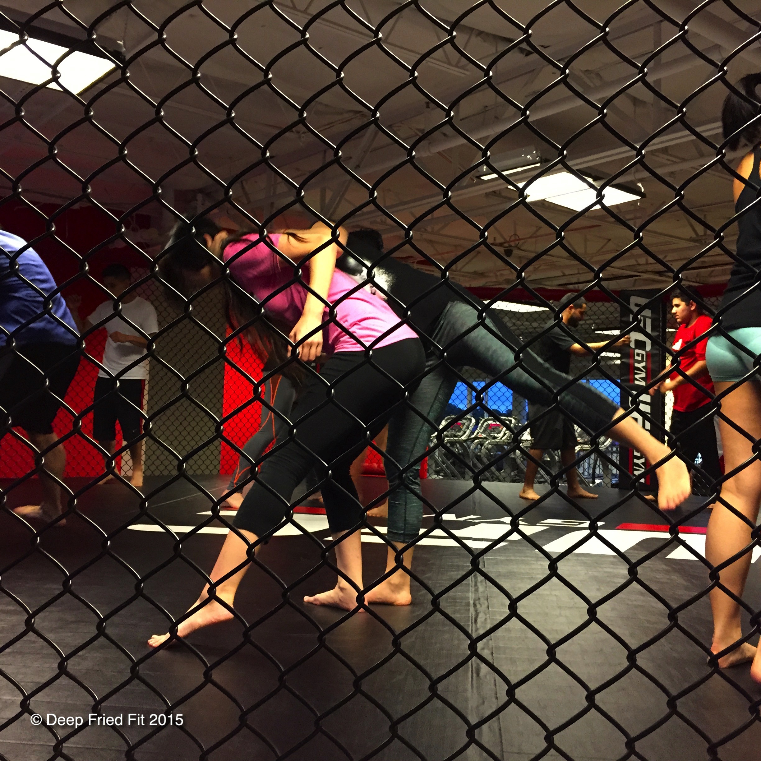 As exhausted as my friends and I were after DUT, when Ron, our instructor, mentioned that a Brazilian jiu jitsu (BJJ) class was next, we mustered the energy to take a second class because we really wanted to spend some time in the octagon. Double header workouts! Holla! The BJJ class welcomes all levels and while most of the members were new, there were a few more experienced students in class. I thought that Ron did a great job balancing the different levels and teaching everyone the basics of BJJ and self defense. It’s a pretty unique class and involves getting pretty close and personal with your partners. We practiced self-defense movements on each other without actually throwing or hurting anyone. It’s more about form and knowing where to place yourself if someone were to attack you. If you can’t handle getting someone’s sweat on you, either skip the class or man up. Extra scrubbing come shower time. Ha!