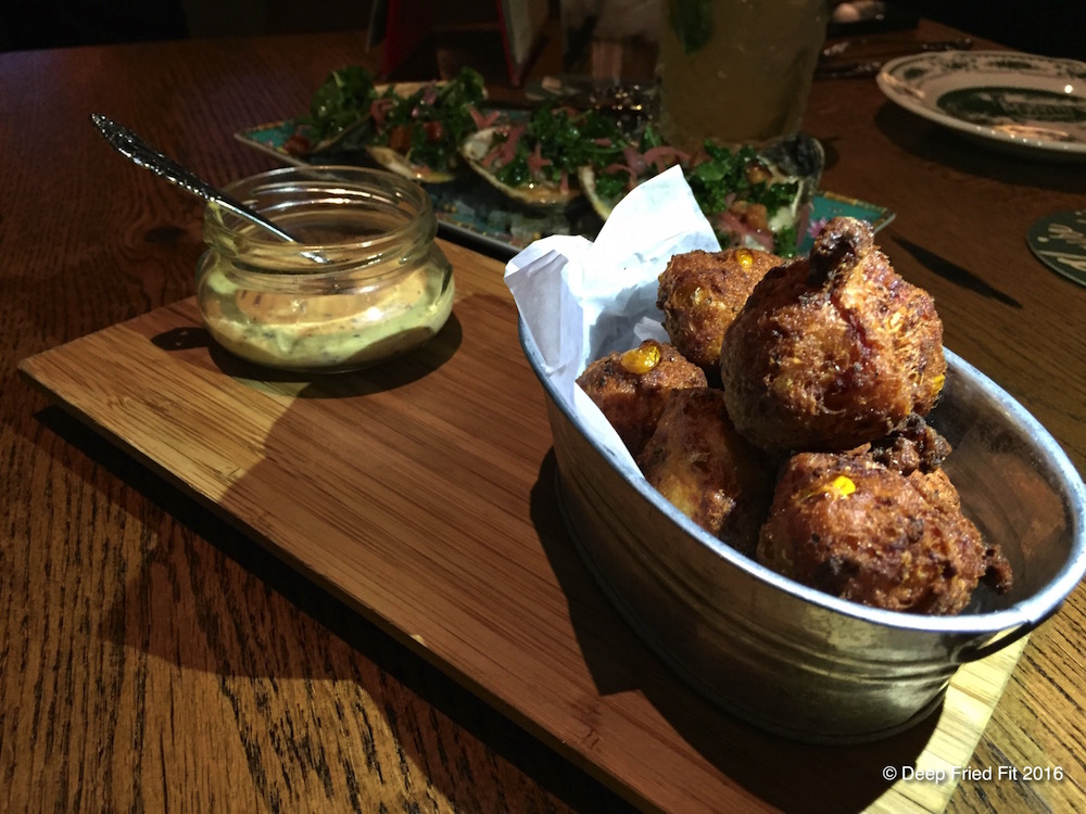 John and I have been foodies for as long as I can remember. My favorite part about our get togethers is how easy it is for us to decide since we have similar fat-kid tendencies and can throw down some food. We started with the crawfish corn fritters with a remoulade dipping sauce.