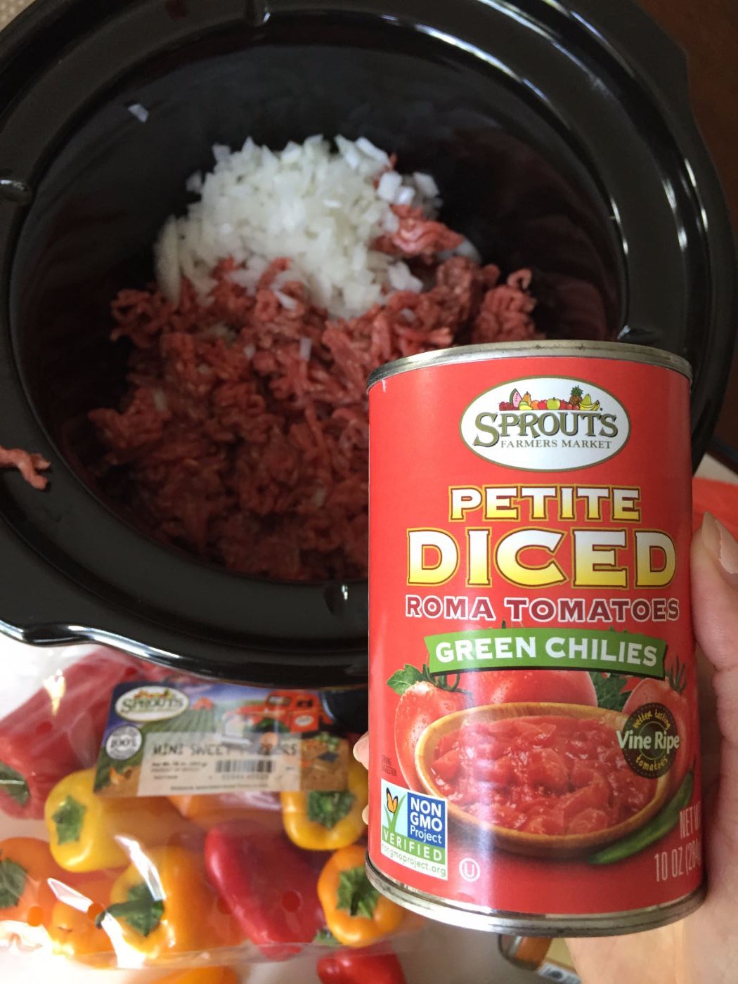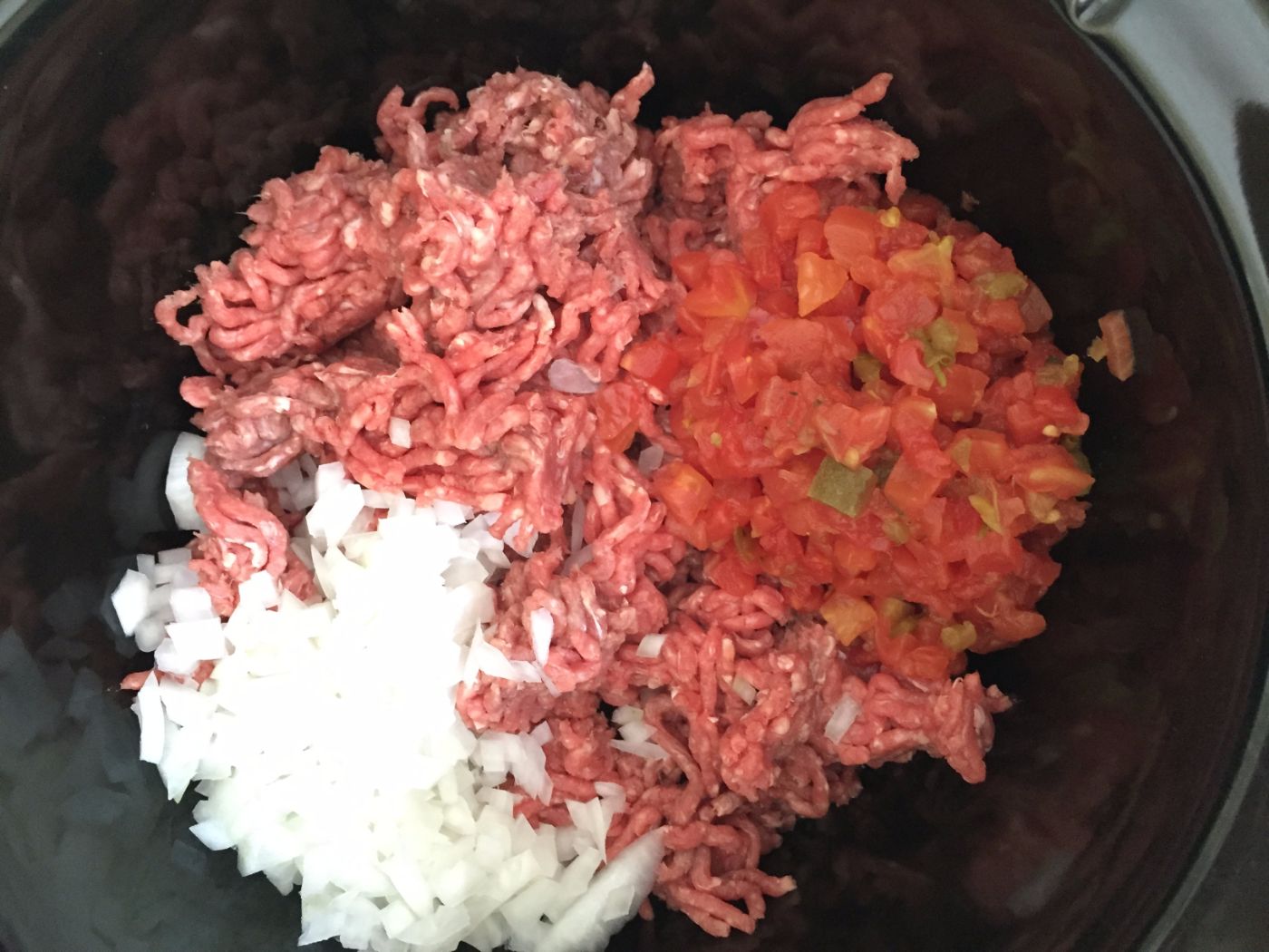 - In a medium crock pot, place the ground meat, chopped onion, diced tomatoes, and 1 cup of water. Stir and cook on high for 4 hours. Stir occasionally.