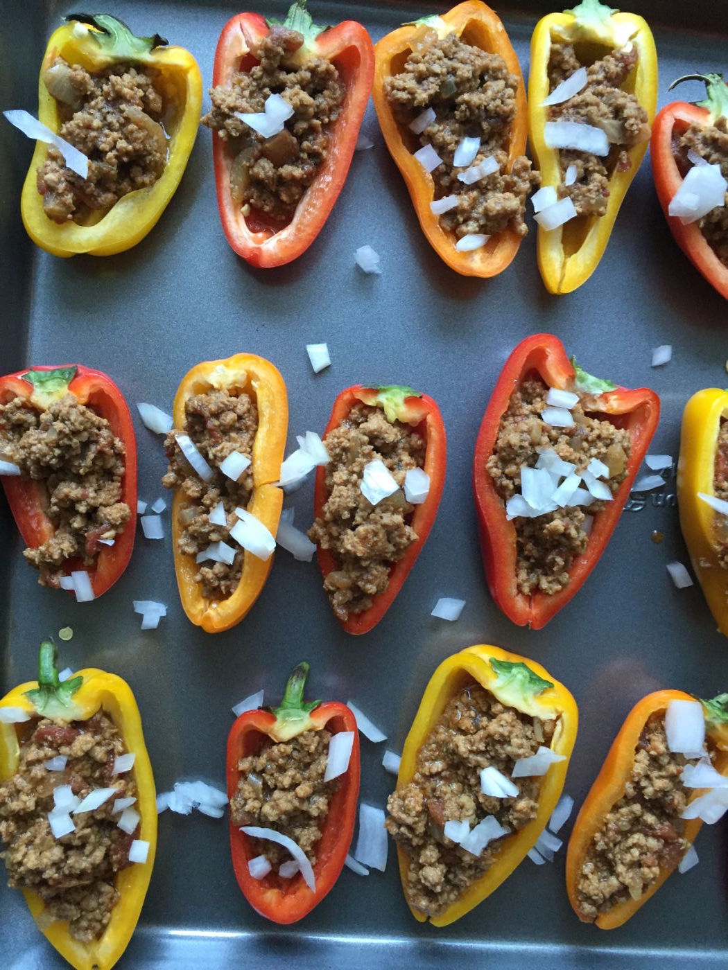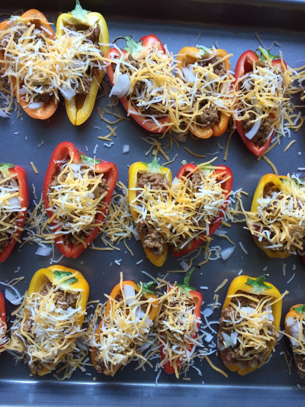 - Spoon taco meat generously into the bell peppers. Add onions and shredded cheese on top. Be generous with the cheese.