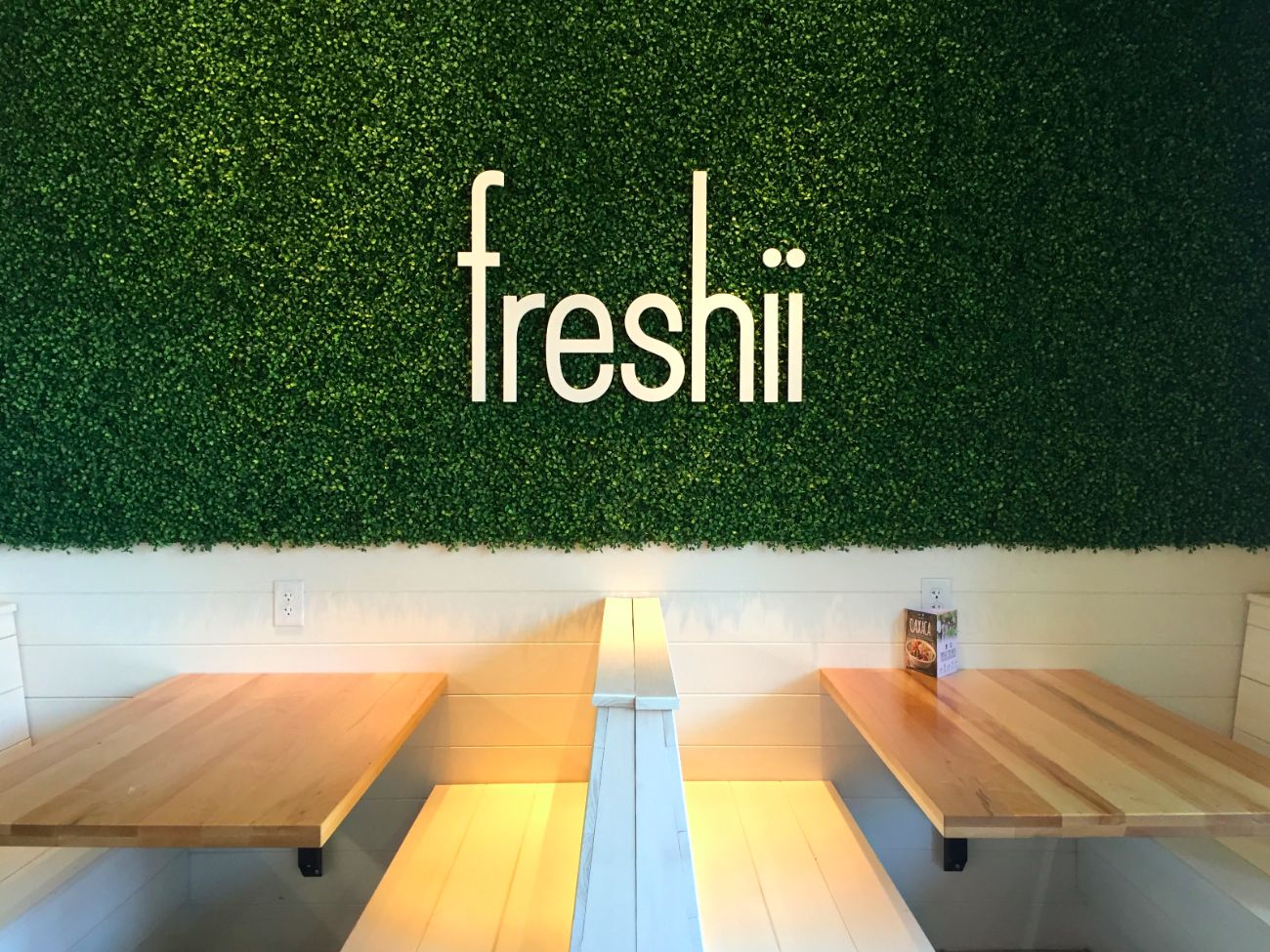 Walking into the newest of the four Freshii locations in Dallas, I was welcomed into a beautiful minimalist space with white walls, wooden tables, and greenery. They’ve created this indoor garden vibe and I love it.