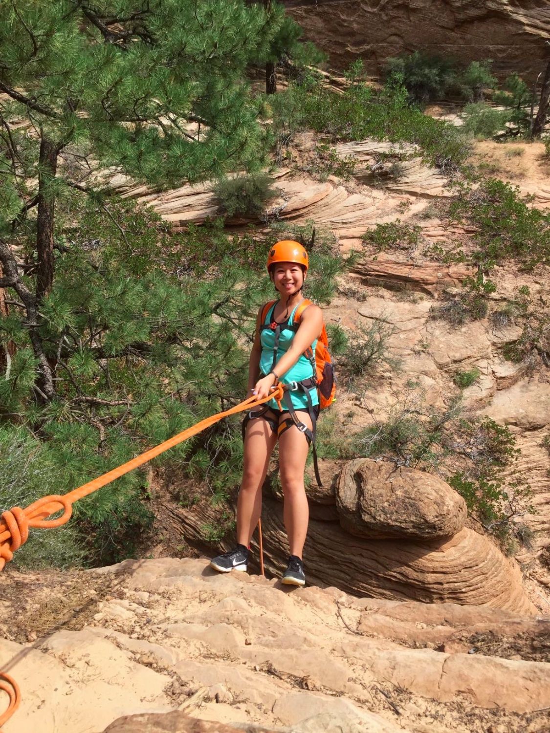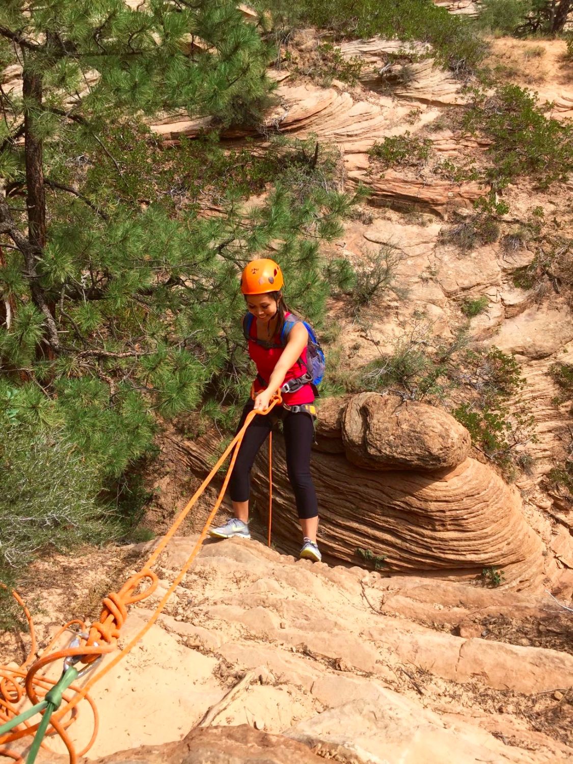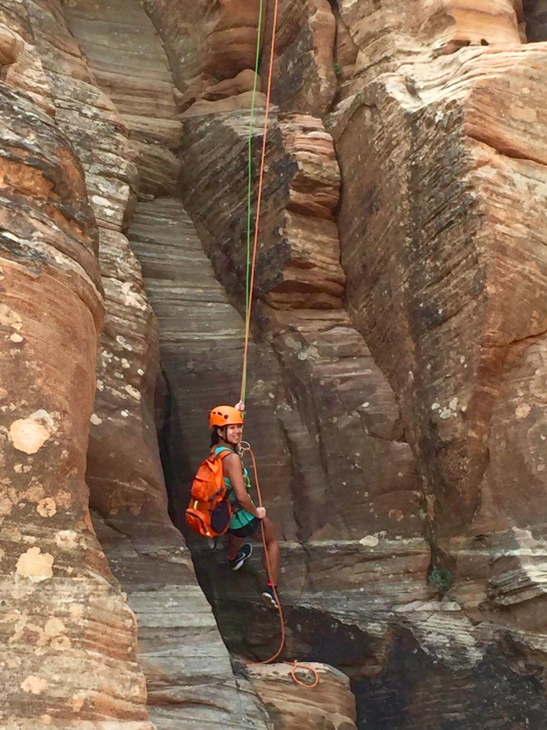 Once we made it to the top, we took a quick snack break and braced ourselves for our first rappel. We strapped on our harnesses and helmets and made sure all of our water bottles and everything was secured. Unlike the 500 ft free rappelling I did off the Reunion Tower in Dallas, we’d essentially be walking backwards down the side of the canyon. Al, Our guide took every pre-caution and made sure we were safely tethered to him before our descent.