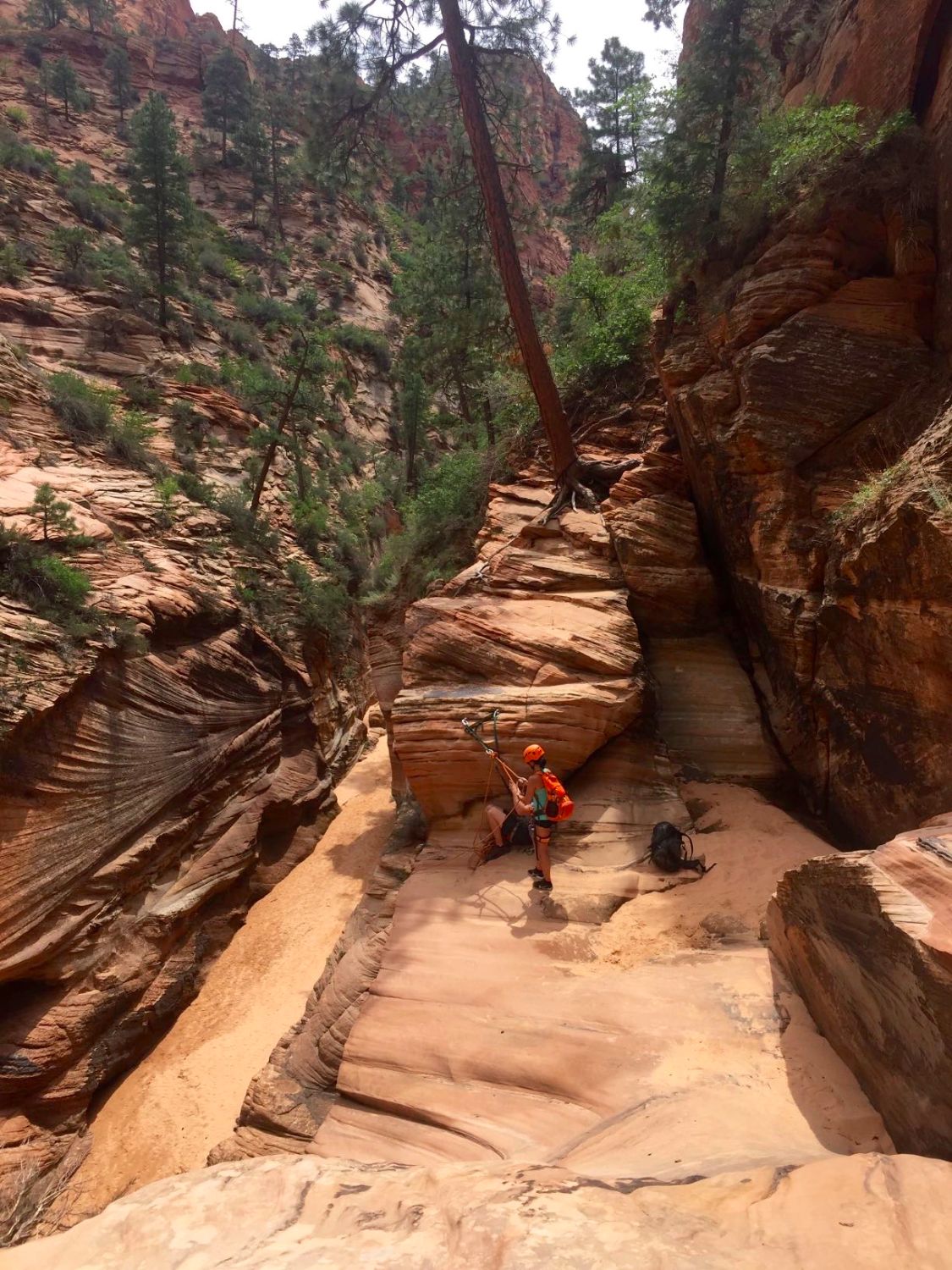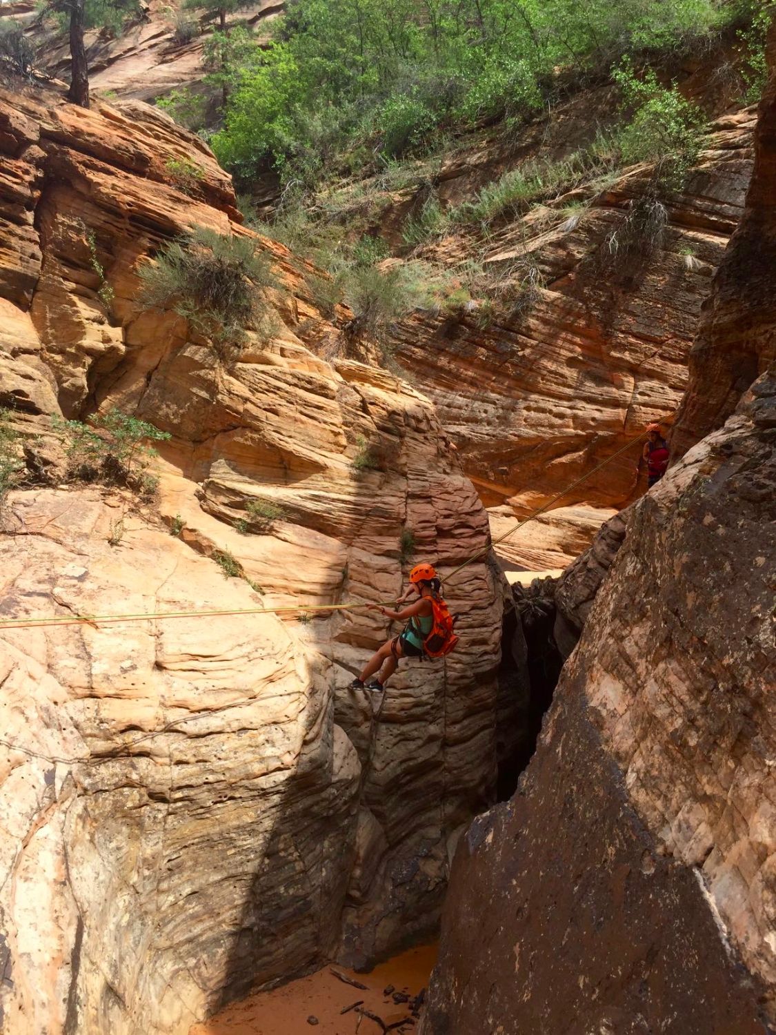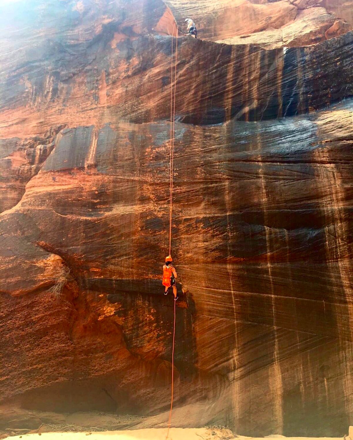 Once we made it to the top, we took a quick snack break and braced ourselves for our first rappel. We strapped on our harnesses and helmets and made sure all of our water bottles and everything was secured. Unlike the 500 ft free rappelling I did off the Reunion Tower in Dallas, we’d essentially be walking backwards down the side of the canyon. Al, Our guide took every pre-caution and made sure we were safely tethered to him before our descent.