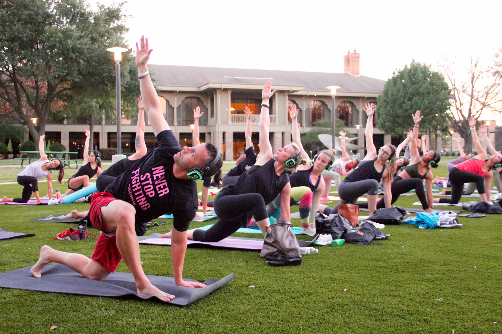 I dreamed of hosting a silent disco yoga class for the first time in Dallas and after much research, sleepless nights, and hard wishing, I finally made that come true. Mike Jackson (MJ) from Corepower was the perfect instructor for the class. I’ve always loved his energy and his music. He lead a great 60 minute sculpt class that combines yoga, core, cardio, and even some barre on the grassy oval lawn by the new JadeWaters. MJ and Catrina Reeder really took care of everyone during the class. It’s definitely one of my favorite formats.