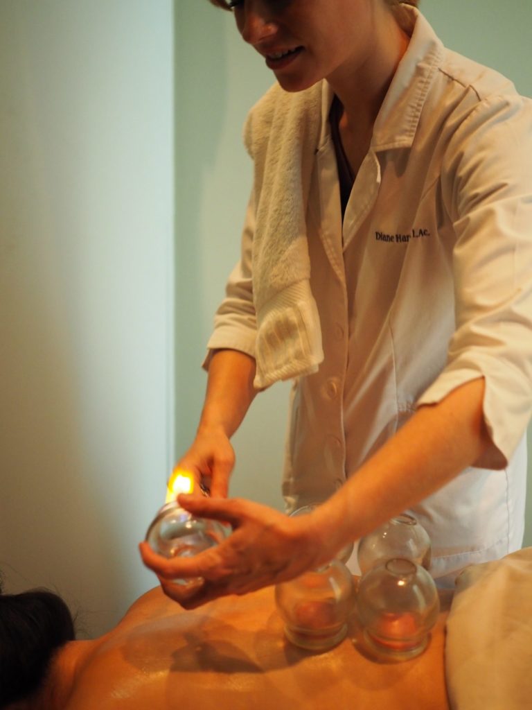 For cupping, the doctor uses a flame to quickly heat the inside of the cup before placing it on your back. It creates a suction that is suppose to draw out negative energy, help with aches and pains in your back and neck, inflammation, circulation, release tension and more.