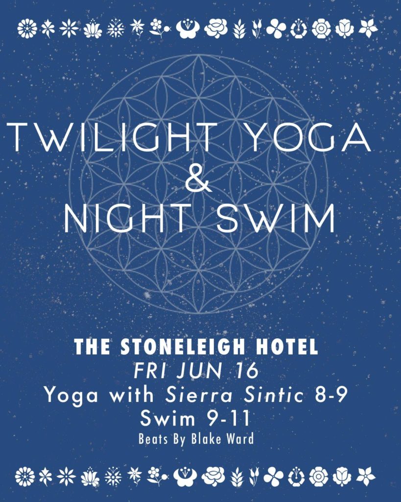 Join Sierra Sintic for a complimentary Yoga Class at The Stoneleigh Hotel. This event is open to the public with class starting at 8pm and followed by cocktails and a night swim 9-11. Feel free to do yoga in your swim attire. Bring your own mat! DJ Blake Ward will be providing beats for the night swim. If you’re not in the mood for yoga, you’re welcome to arrive at 9 for swimming. Namaste!