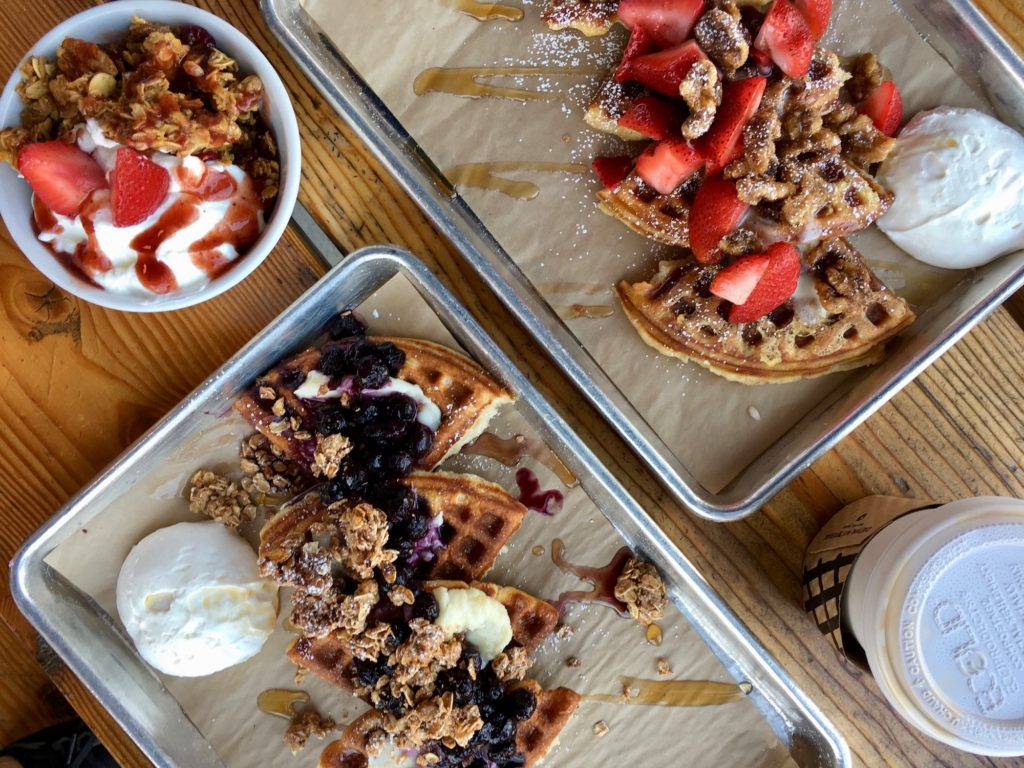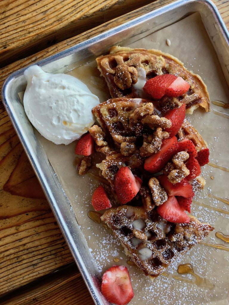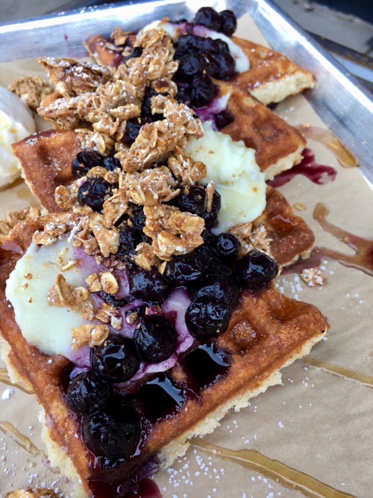 We all ordered a few things to share. I loved the french toast waffle and the blueberry cobbler waffle. They didn’t have a ton of breakfast options and I can see this place being more of a lunch and dinner spot. It was too early for me to want the pizza waffle.