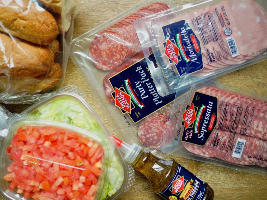 You can honestly choose whatever meats you like. I selected cuts that I loved and new ones to try. I sliced the hoagies halfway to make it like a sub. Layered the cheeses first, then the meats, tomatoes and lettuce. Sprinkles pepper and the hoagie dressing on top. I also like duck liver pate. Didn’t use it this time, but will definitely be adding next time.