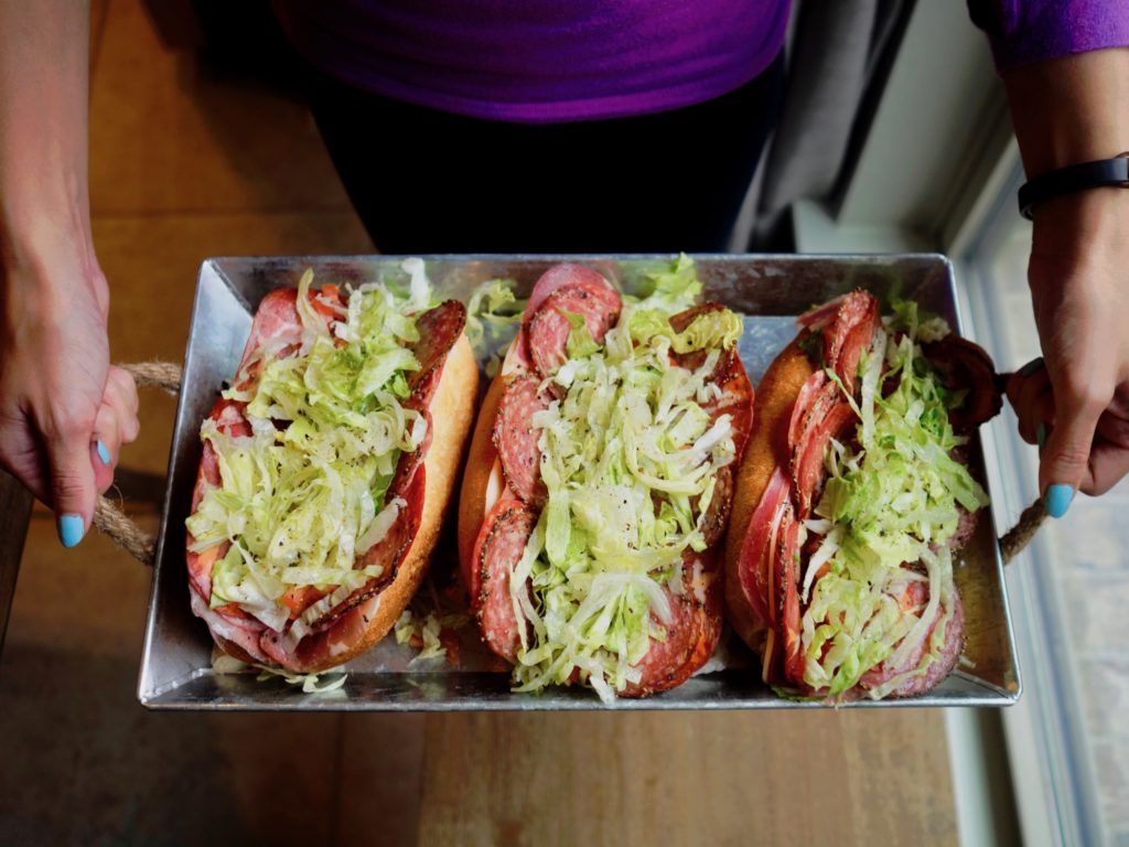 After the finishing touches, cut it in half and serve on trays. These are some epic sandwiches and the goal is for everyone to be happy and full. The beauty about these being cold cut sandwiches makes it easy to keep.