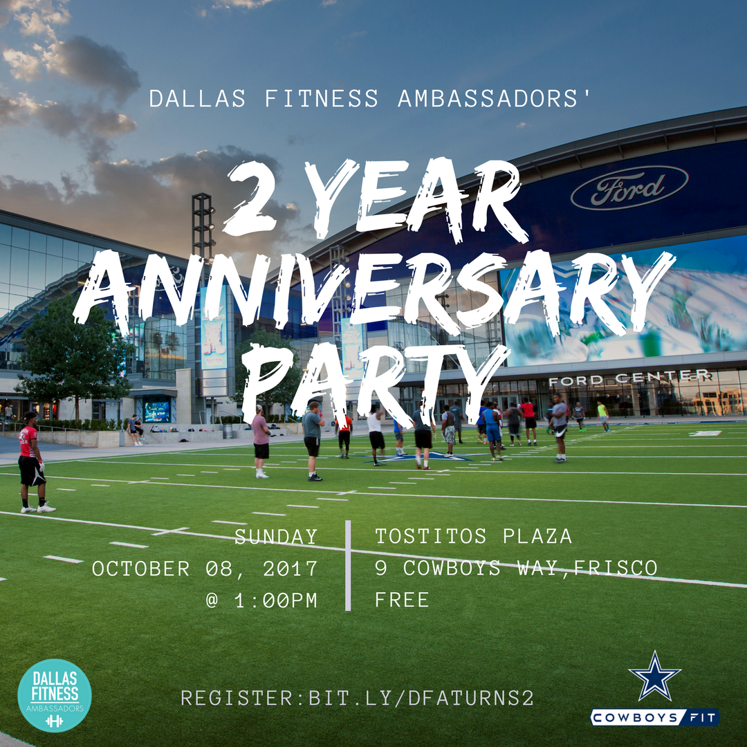 DFA is turning 2 and you’re invited to our epic birthday bash. We’ll be sweating to an awesome Cowboys Fit bootcamp style workout on the Tostitos Championship Plaza at The Star in Frisco. Work-out is for adults (or children at least 12years of age and up). There is also child care available for younger children as well. After class, take a load off and enjoy refreshments and light bites. This is a family friendly event, so feel free to bring the family and kiddos for a fun football themed post workout party.