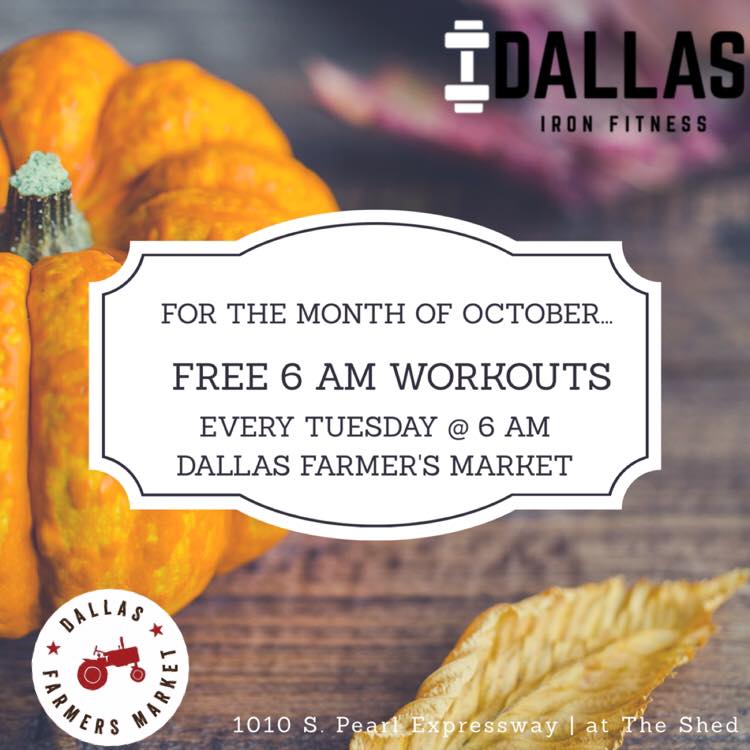 Start your day with the best sweat from Dallas Iron Fitness. Head to the Dallas Farmers Market for a complimentary bootcamp workout at 6am. Bring water, a mat, and your energy!