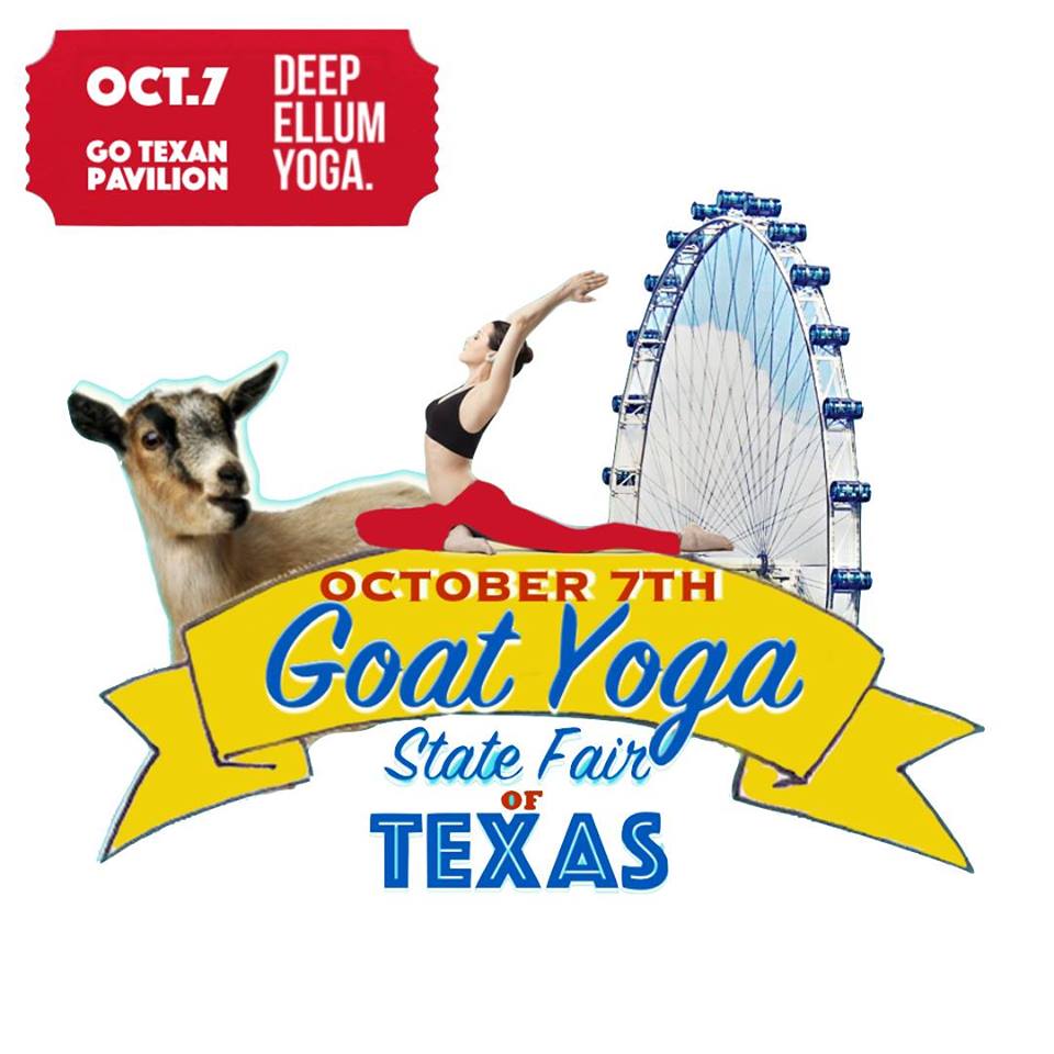 Join The Deep Ellum Yoga team as they showcase Goat Yoga at The State Fair of Texas. Set upon the main stage at the GO TEXAN pavilion, participants will demonstrate their best yoga skills in a 40 minute vinyasa-flow class, led by Shannon J and her 6 baby goat assistants. They will provide your mat and towel. For full ticket information, please click on the ticket link above.