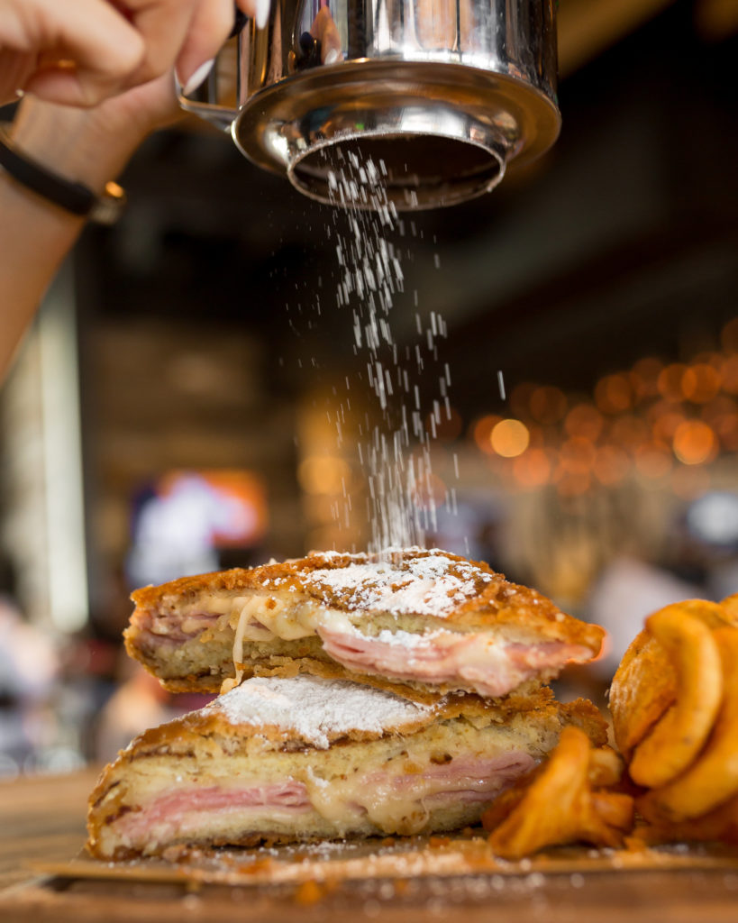 I had a few bites after taking this shot and holy jeebus. A Monte Cristo is a ham and cheese sandwich that is dipped in egg and fried. AND It’s cooked in freakin pancake batter!!! WUT?!