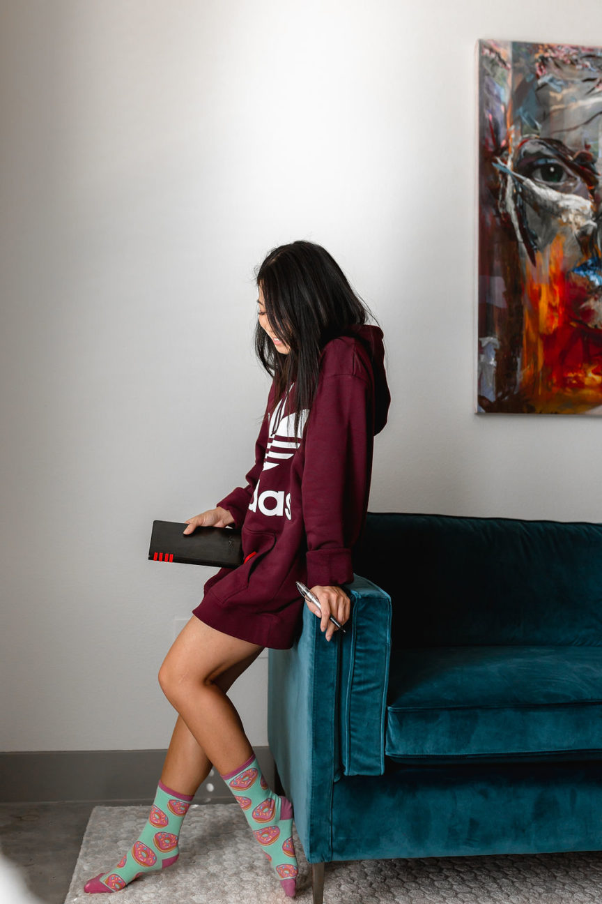 Thanks for reading and following along. I hope some of these tips were helpful in case you were looking for ways to reset. Shoutout to adidas for this amazing lounge wear. I’m wearing the black crossback bra but linked a similar one here. Also, loving this oversized sweater in maroon. You can find similar one here.