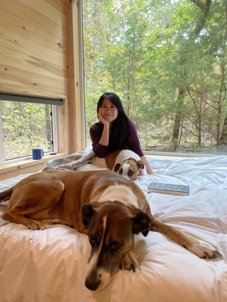 It’s the cutest thing. If you’re curious about tiny homes, this is a fun experience. You’d be so surprised how everything fits and how comfortable it was. Mind you, it was the two of us plus two medium sized-dogs. It has a comfy bed, a small dining table, bathroom, shower, and kitchenette. The outside is complete with a campfire, picnic table and additional chairs and firewood.